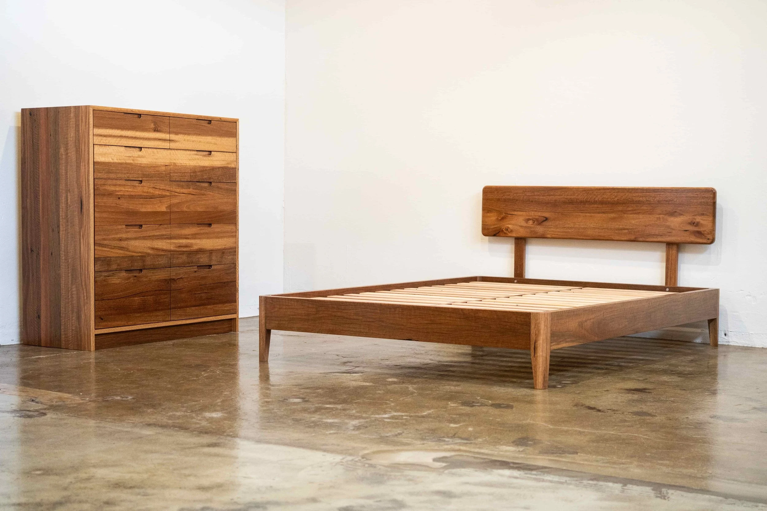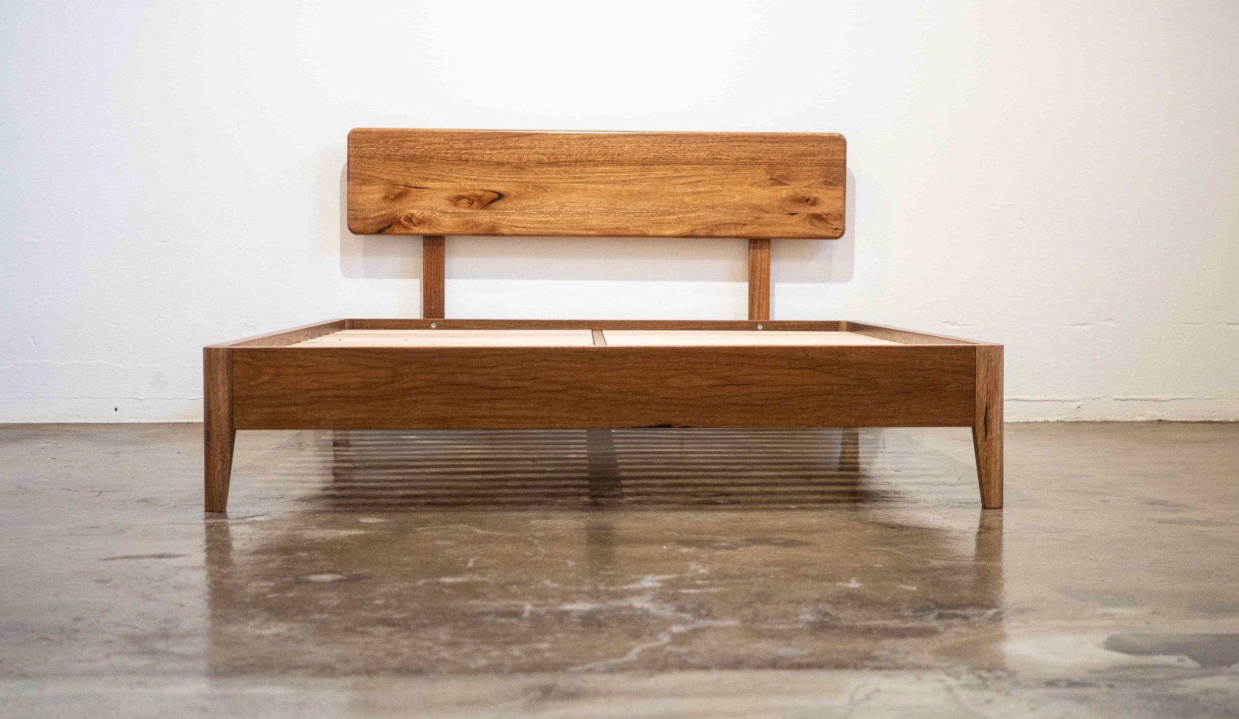 You can also choose a version of the bed without the headboard, as pictured below concealed stub tenon joins are used where the rails meet the head and foot combined with our high strength custom hardware for easy disassembly. The base can be made with slotted plywood inserts or recycled hardwood slats.