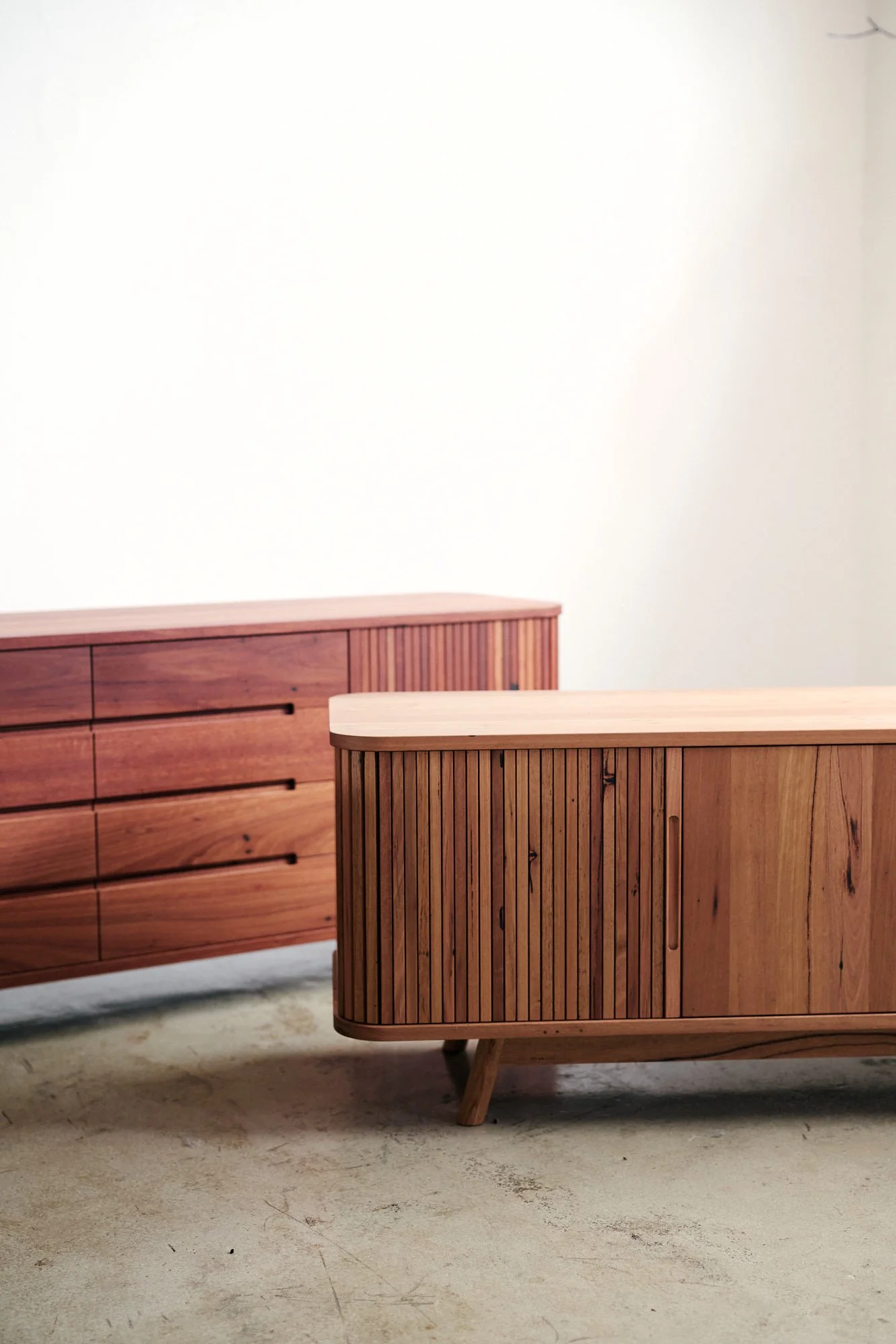 If you’ve had your eye on the Tambour design, this is the perfect opportunity to skip the queue and bring one home today. We currently have two Tambour Sideboards in Blue Gum / Coastal Reds, highlighting the rich tones and expressive grain of these recycled timbers, and one Tambour Sideboard in Canberra Local Ash, offering a lighter, contemporary feel that complements a wide range of interiors. All the three Tambour Sideboards in stock are built to our favourite design with eight central grain matched drawers.