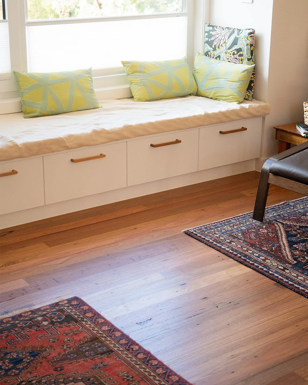Even the smaller offcuts found new purpose. Rob from Affinity Kitchens and Joinery, who crafted the joinery for the home, used the remaining pieces to create open shelving throughout the new residence, creating subtle touches that continue the story of reuse and renewal.