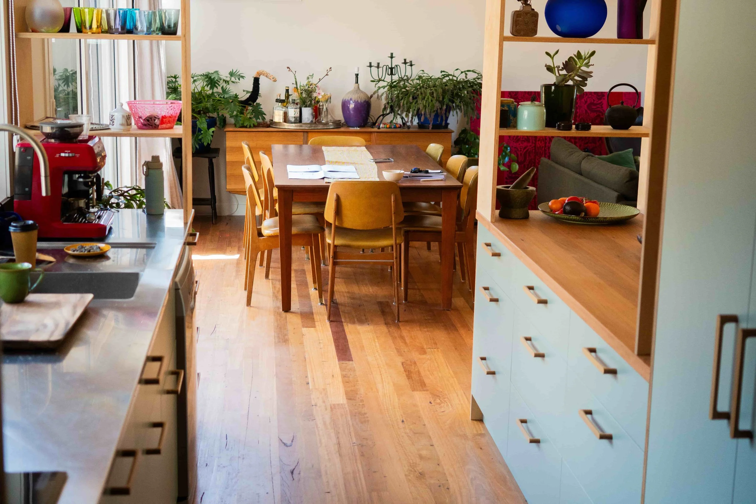 Blackbutt recycled timber flooring, with benchtops in Canberra Local Ash salvaged from the old house.