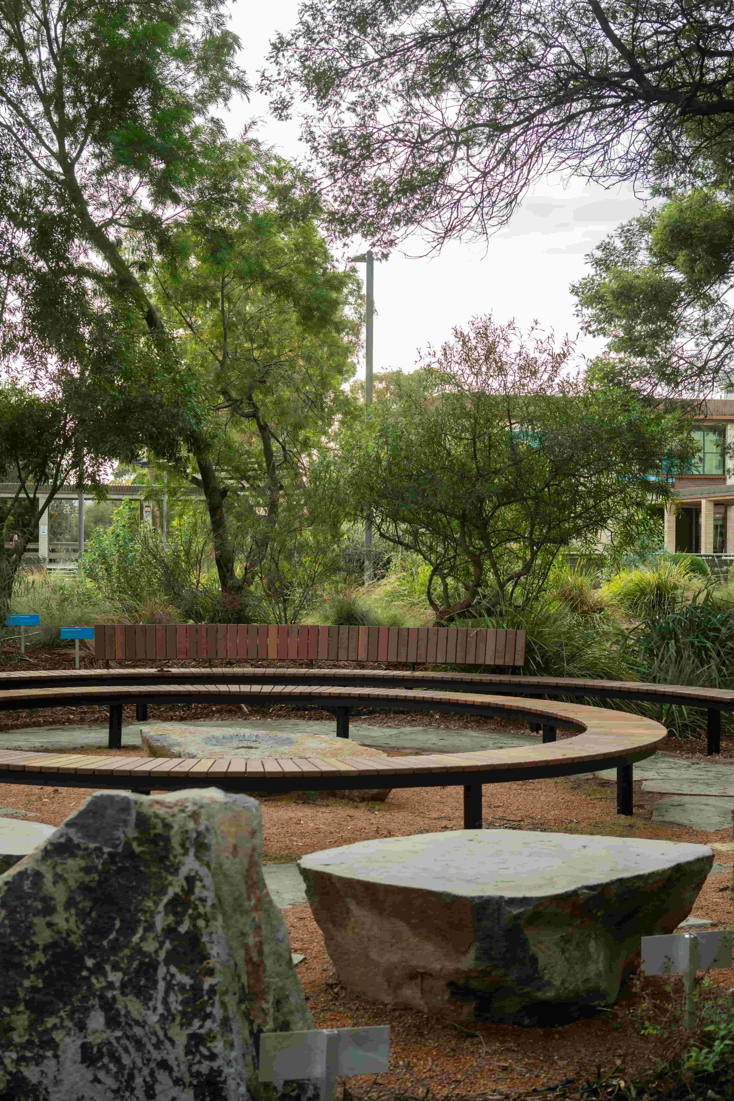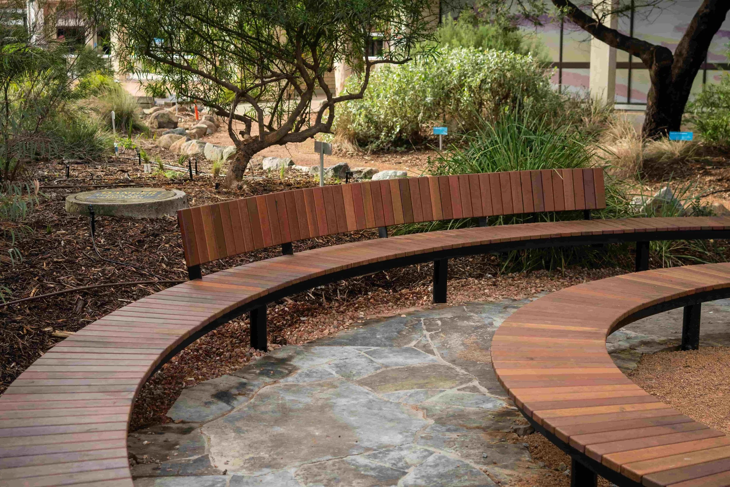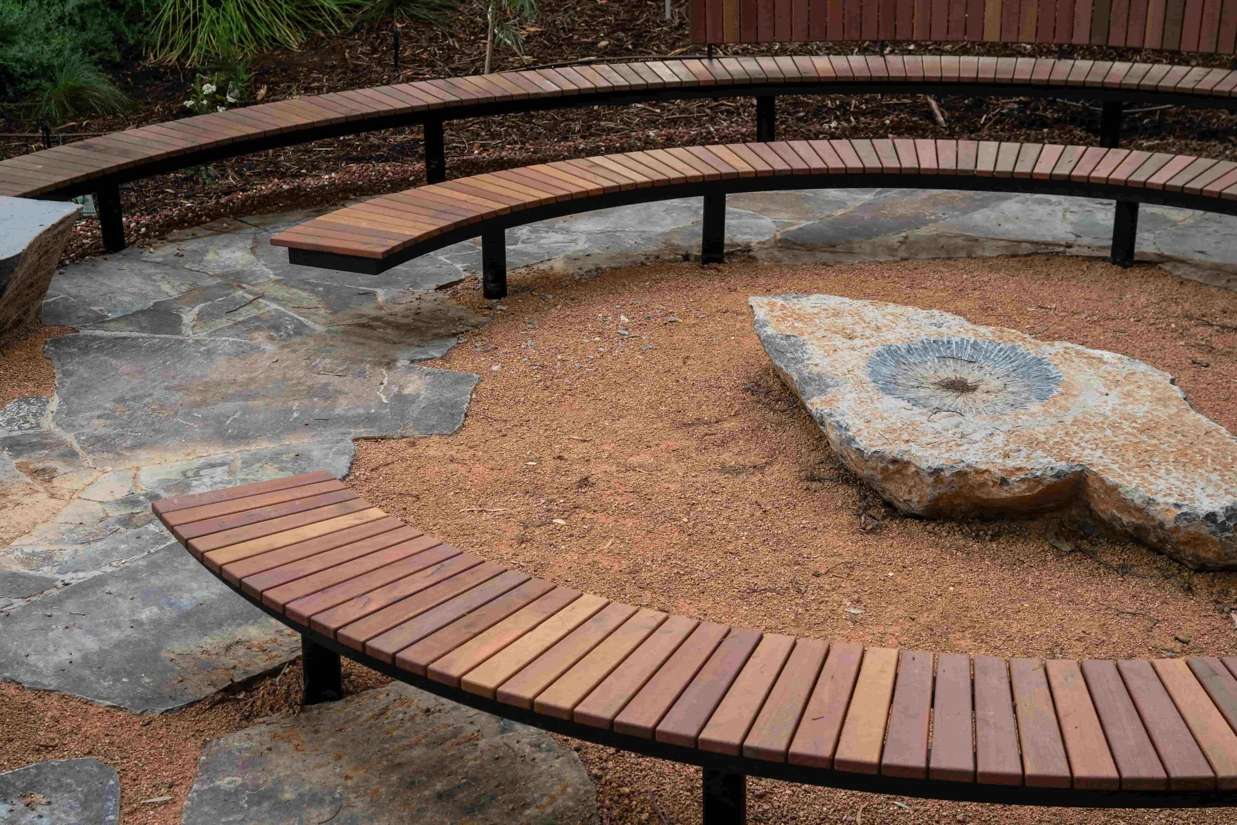 The Yarning Circle was installed in a beautifully landscaped native garden.